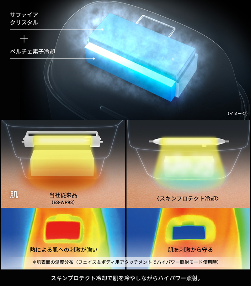 さらに!熱に強いサファイアガラスの照射面が、肌への刺激を抑えて、冷却機能をサポート!